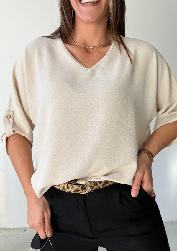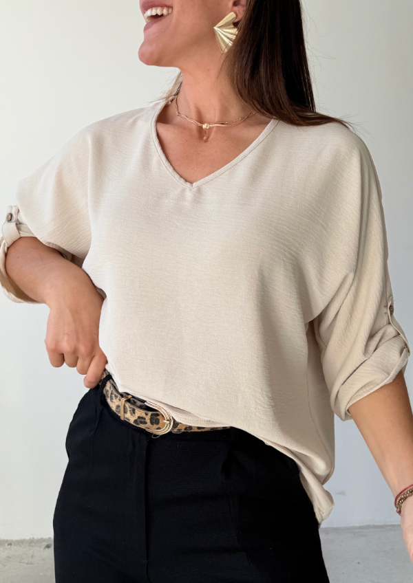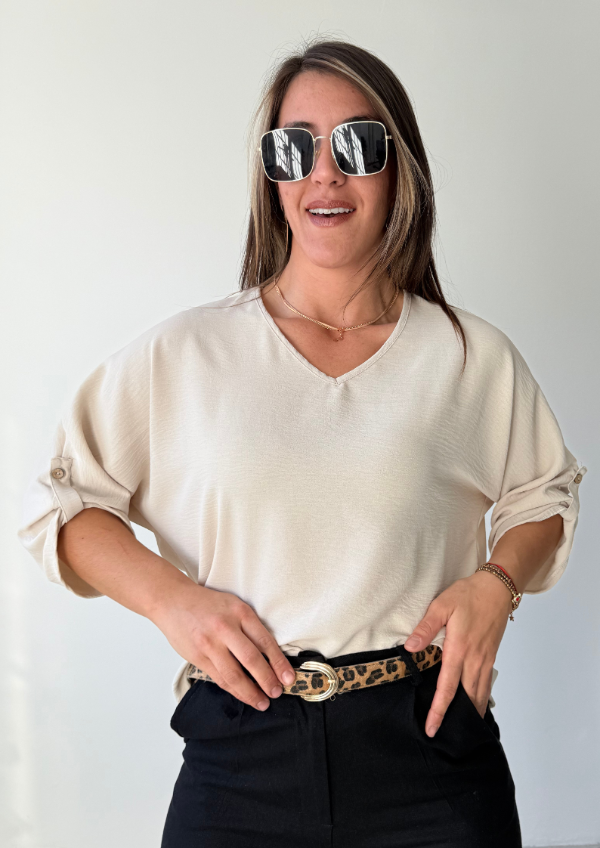 • Blusa escote en V. Manga 3/4 con el detalle de tira y botón para sujetar la manga. Es un modelo super amplio y comodo. Tapa la cola.