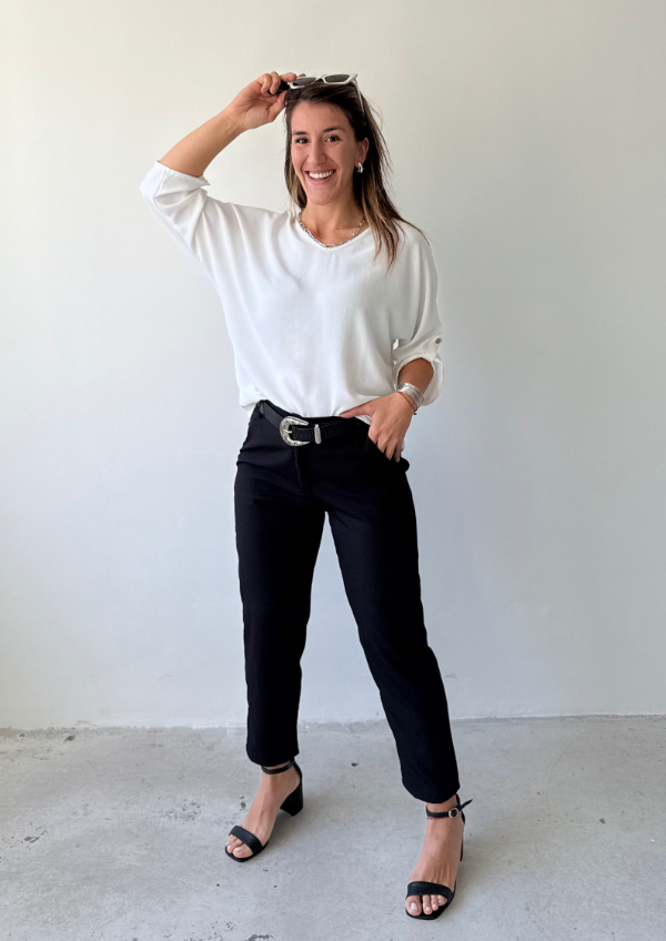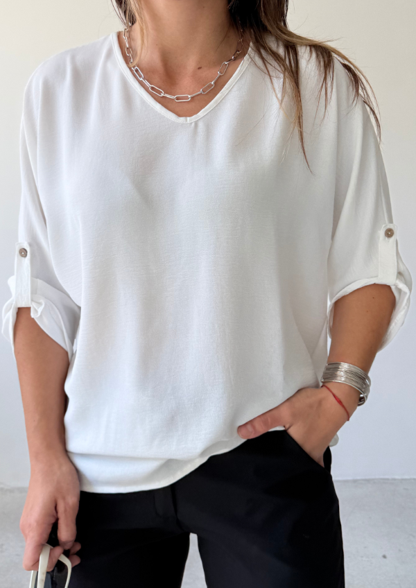 • Blusa escote en V. Manga 3/4 con el detalle de tira y botón para sujetar la manga. Es un modelo super amplio y comodo. Tapa la cola.