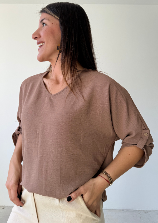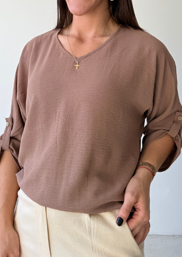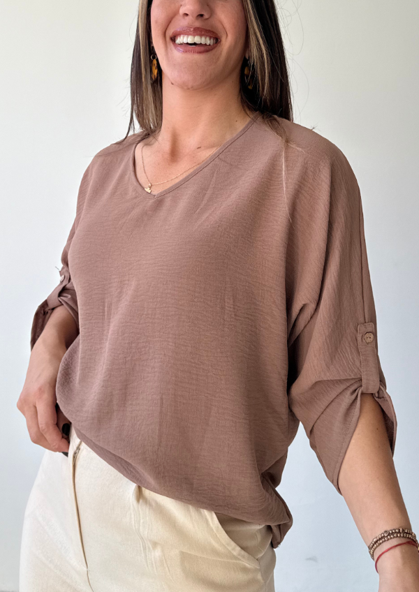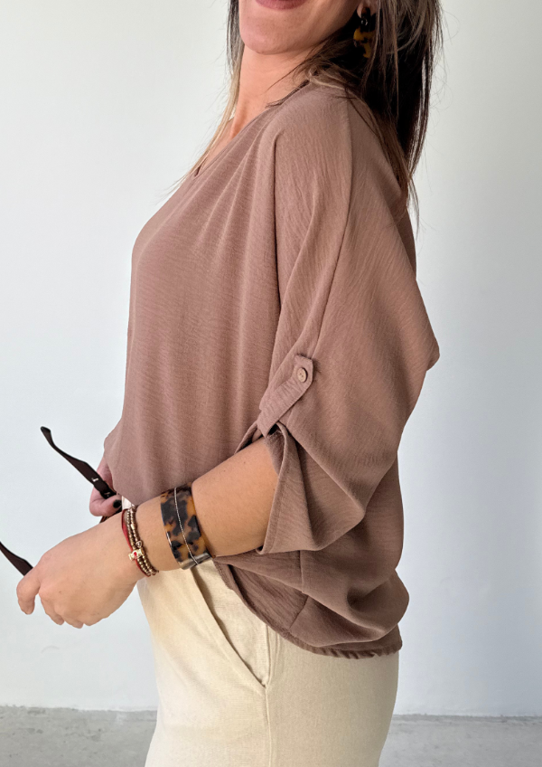 • Blusa escote en V. Manga 3/4 con el detalle de tira y botón para sujetar la manga. Es un modelo super amplio y comodo. Tapa la cola.