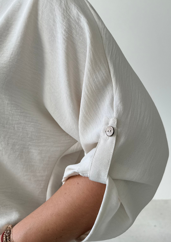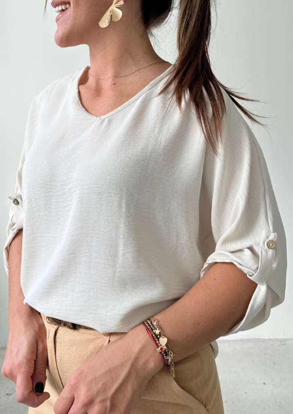 • Blusa escote en V. Manga 3/4 con el detalle de tira y botón para sujetar la manga. Es un modelo super amplio y comodo. Tapa la cola.
