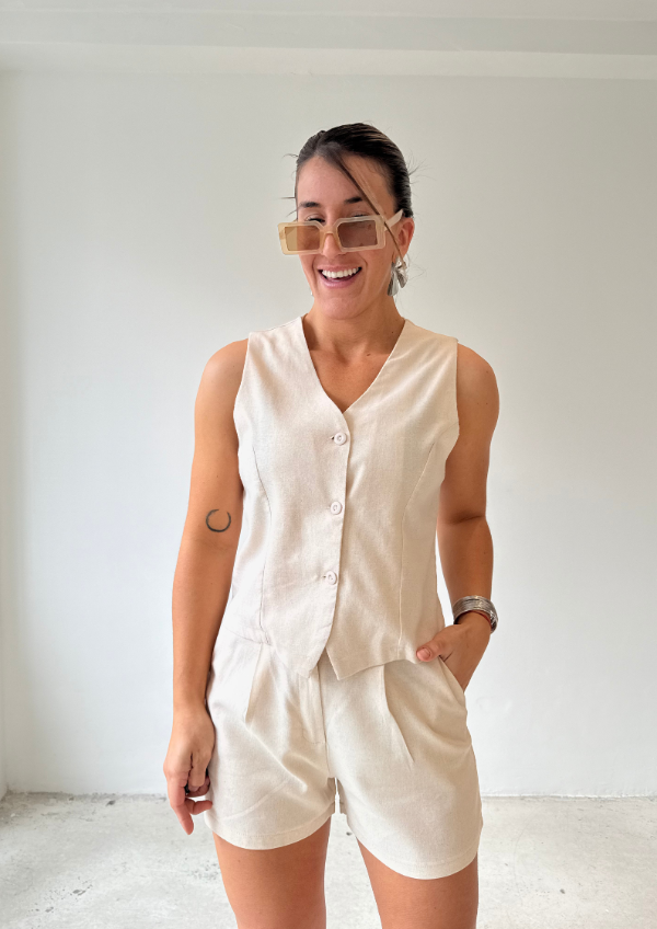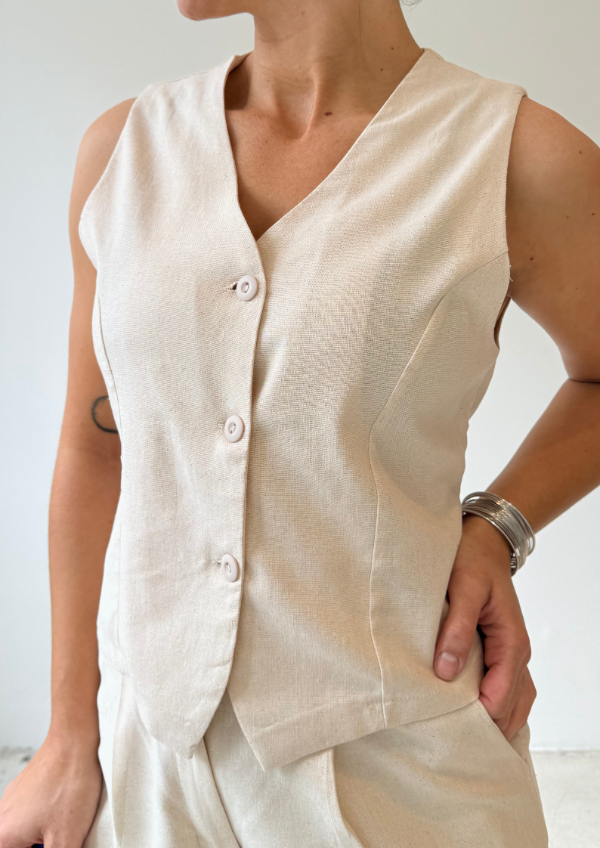 • Chaleco sastrero, pinzado, con lazo en la espalda para entallarlo.