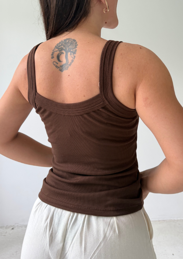 • Remera musculosa, super elastizada. Escoté irregular redondo, breteles anchos y como detalle doble vivo en toda la prenda.