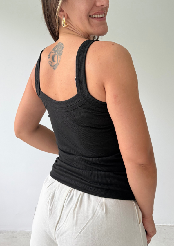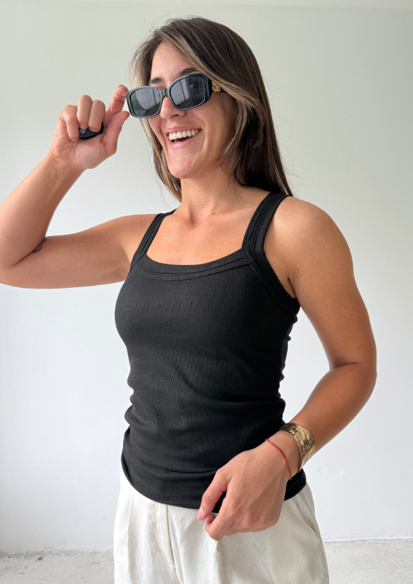 • Remera musculosa, super elastizada. Escoté irregular redondo, breteles anchos y como detalle doble vivo en toda la prenda.