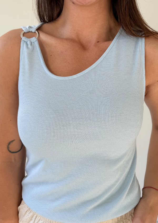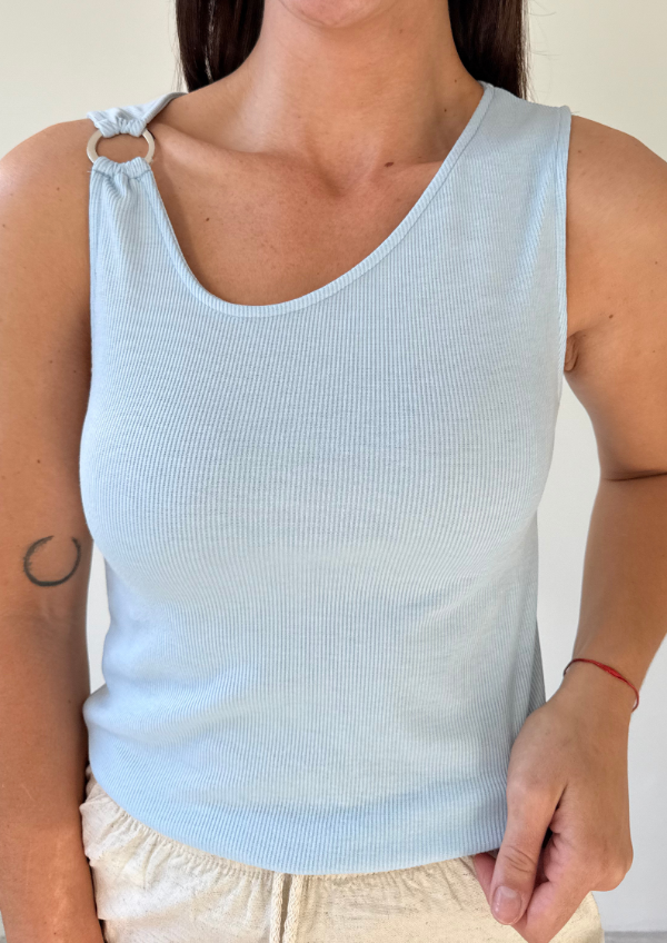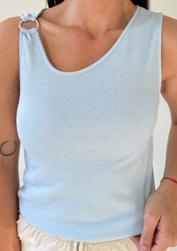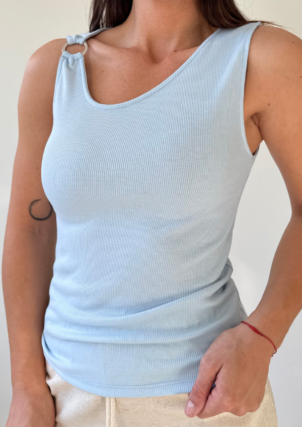 • Remera musculosa, super elastizada. Escoté irregular en delantera con detalle de la argolla de acero (no se oxida) en uno de los breteles.