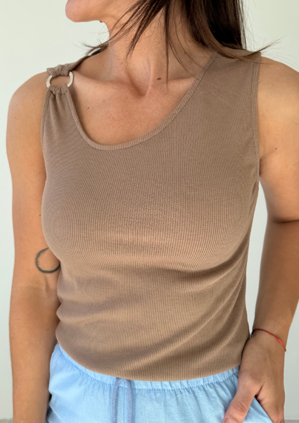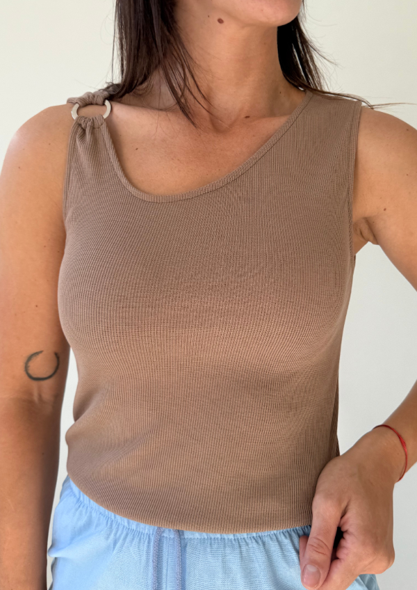 • Remera musculosa, super elastizada. Escoté irregular en delantera con detalle de la argolla de acero (no se oxida) en uno de los breteles.