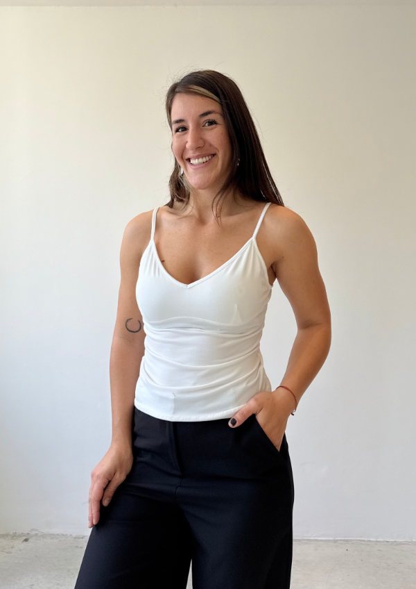 • Remera musculosa con breteles, escote en V, con vivos finos, super elastizada. Espalda recta, detalle del Corpiño forrado en la delantera.