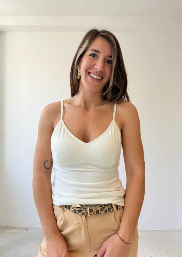 • Remera musculosa con breteles, escote en V, con vivos finos, super elastizada. Espalda recta, detalle del Corpiño forrado en la delantera.