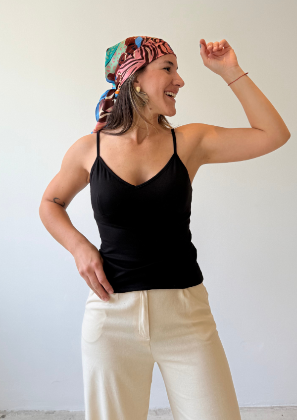 • Remera musculosa con breteles, escote en V, con vivos finos, super elastizada. Espalda recta, detalle del Corpiño forrado en la delantera.