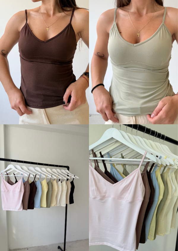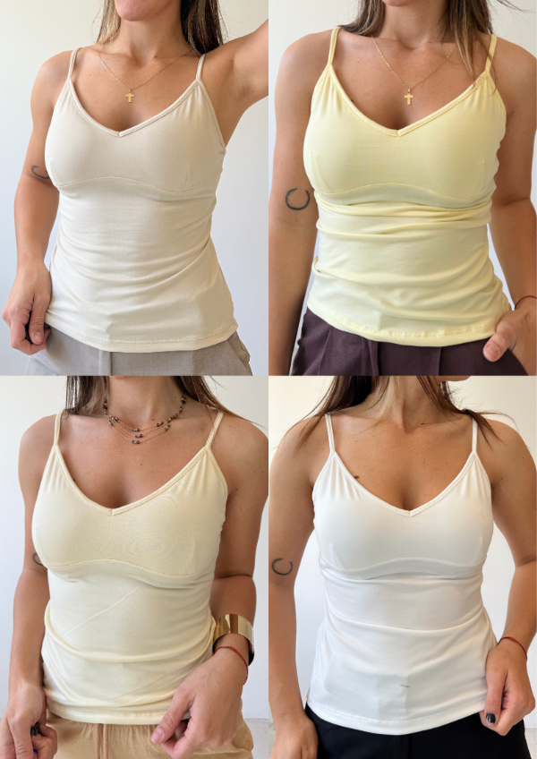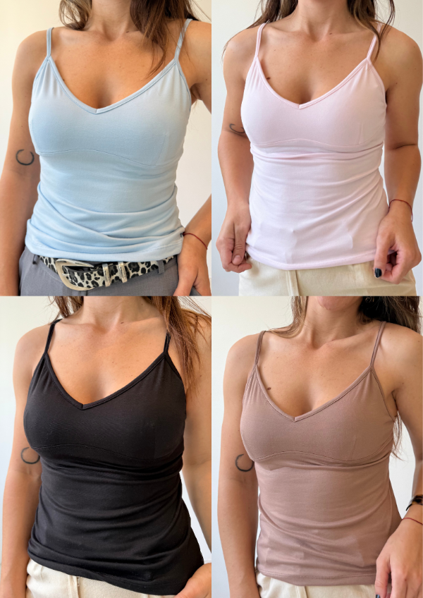 Remera musculosa con breteles, escote en V, con vivos finos, super elastizada. Espalda recta, detalle del Corpiño forrado en la delantera.