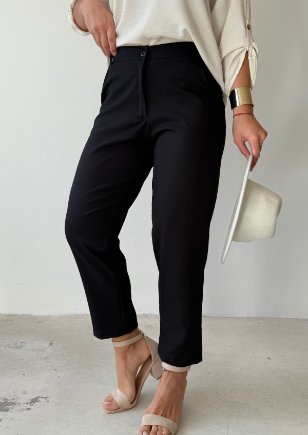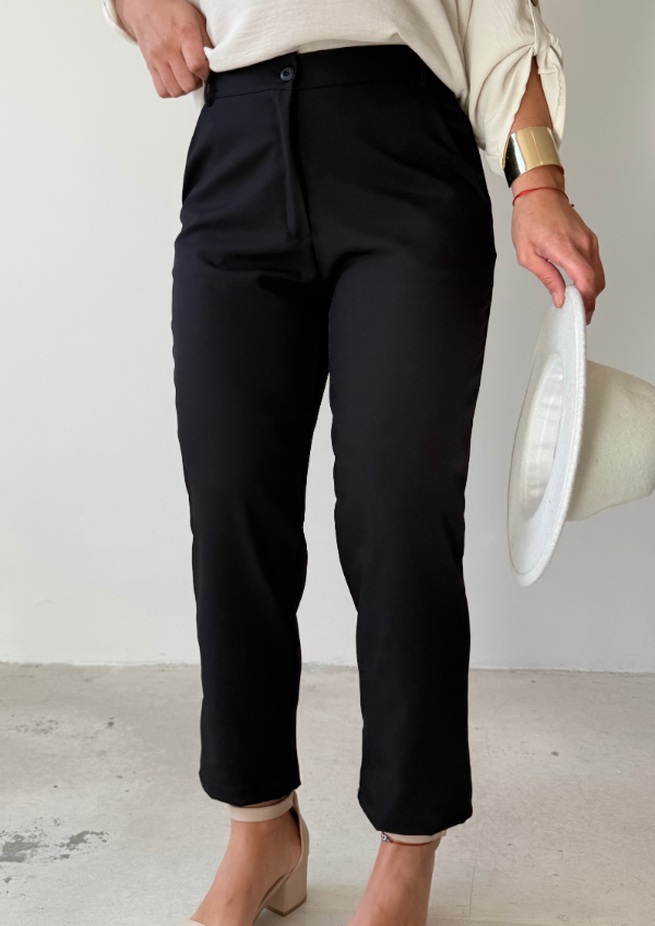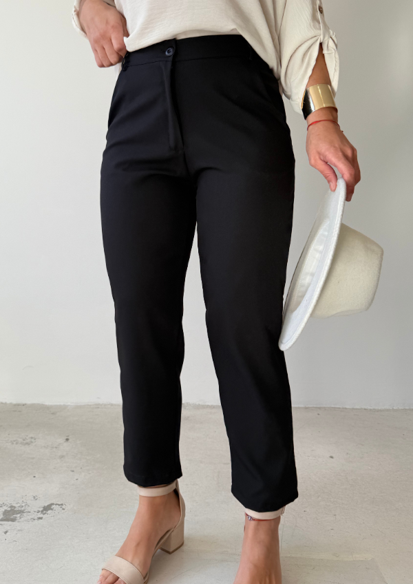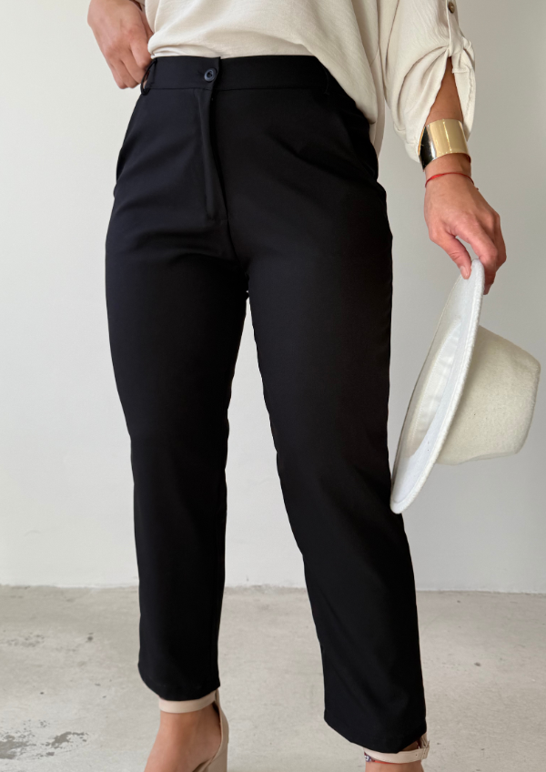 • Pantalón sastrero, tiro alto. Cuenta con cierre, botón & presillas para cinturón. En la parte trasera, la cintura tiene elástico para un mejor calce, comodidad y amplitud de la prenda.