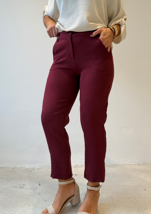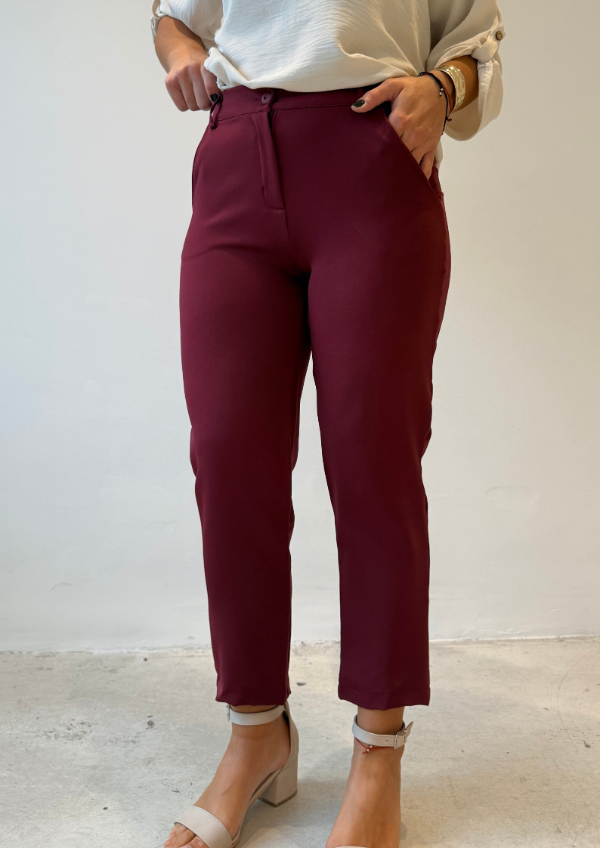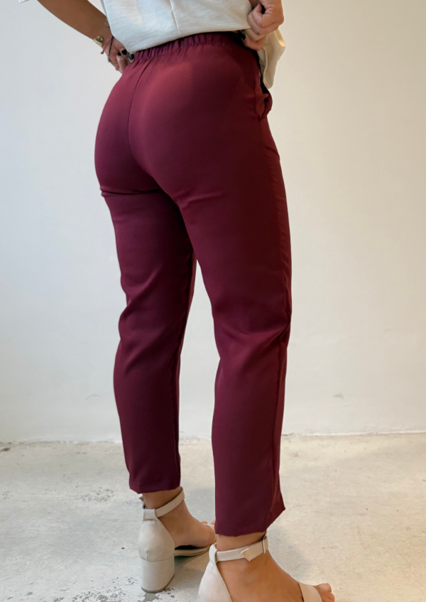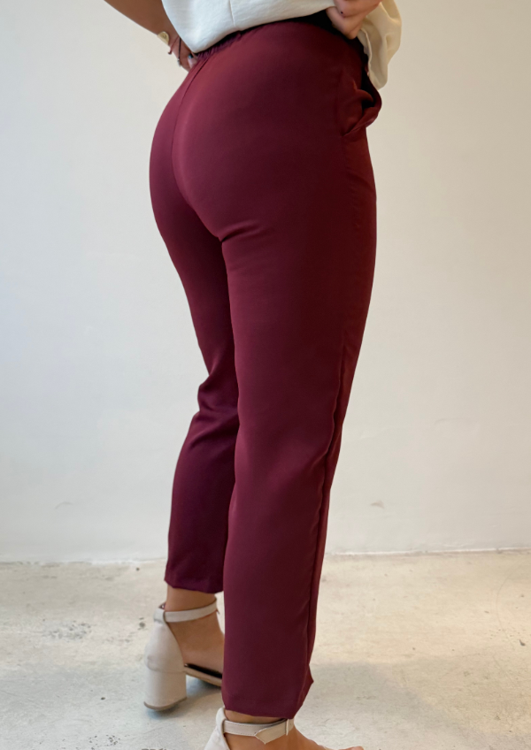 Pantalón sastrero, tiro alto. Cuenta con cierre, botón & presillas para cinturón. En la parte trasera, la cintura tiene elástico para un mejor calce, comodidad y amplitud de la prenda.