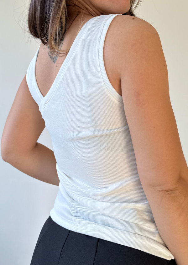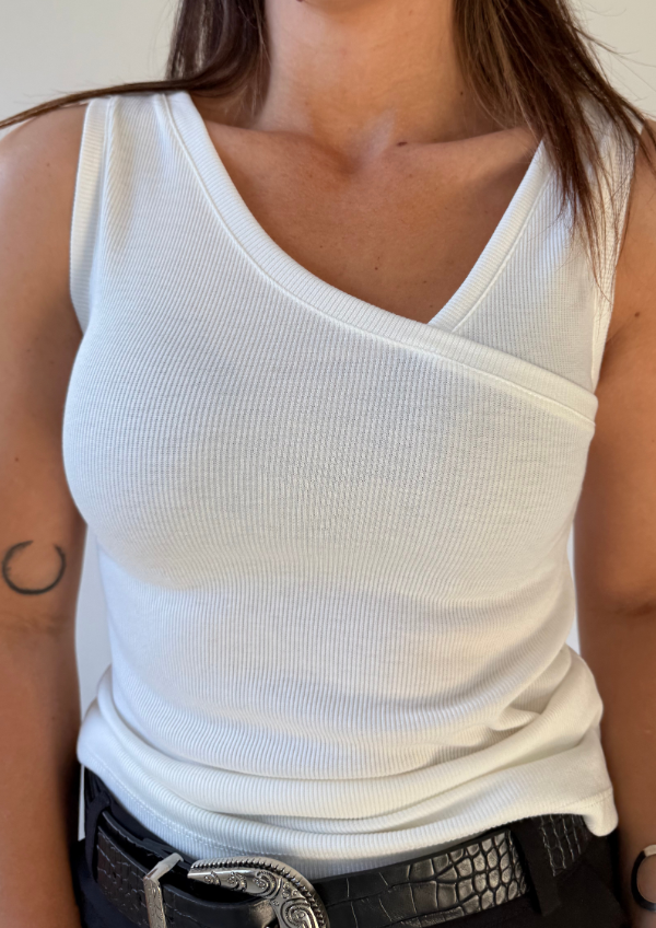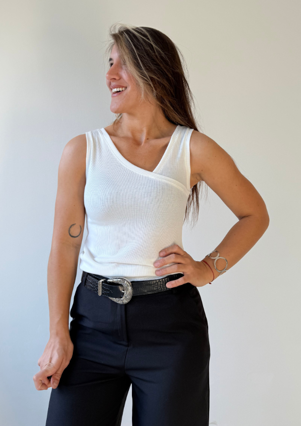 • Remera musculosa, super elastizada. Escoté irregular en delantera y trasera.