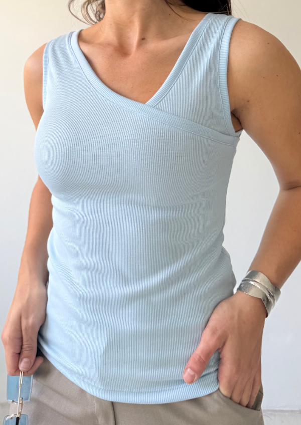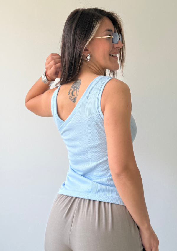 • Remera musculosa, super elastizada. Escoté irregular en delantera y trasera.