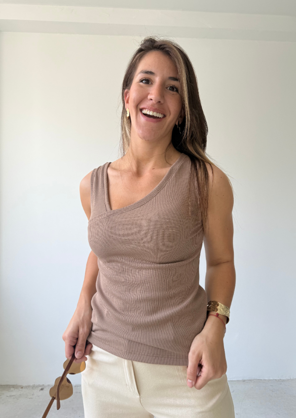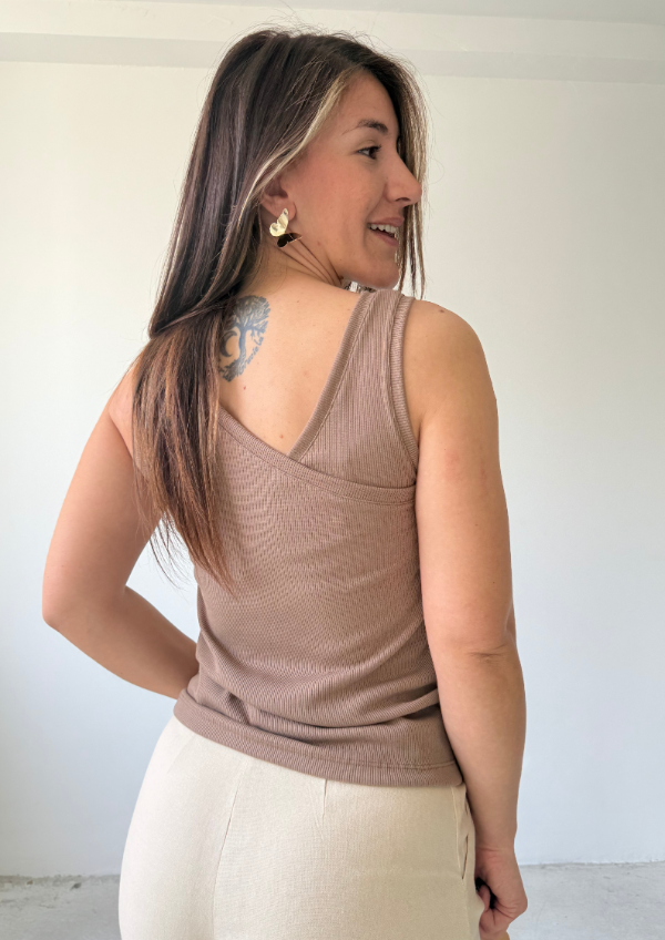 • Remera musculosa, super elastizada. Escoté irregular en delantera y trasera.