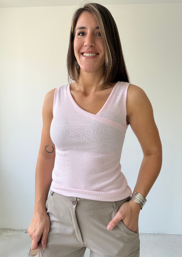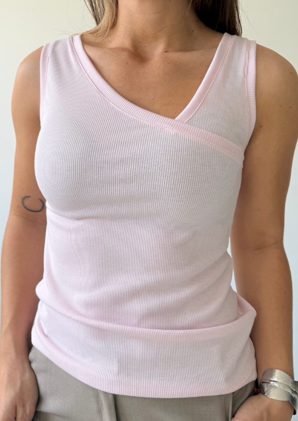 • Remera musculosa, super elastizada. Escoté irregular en delantera y trasera.