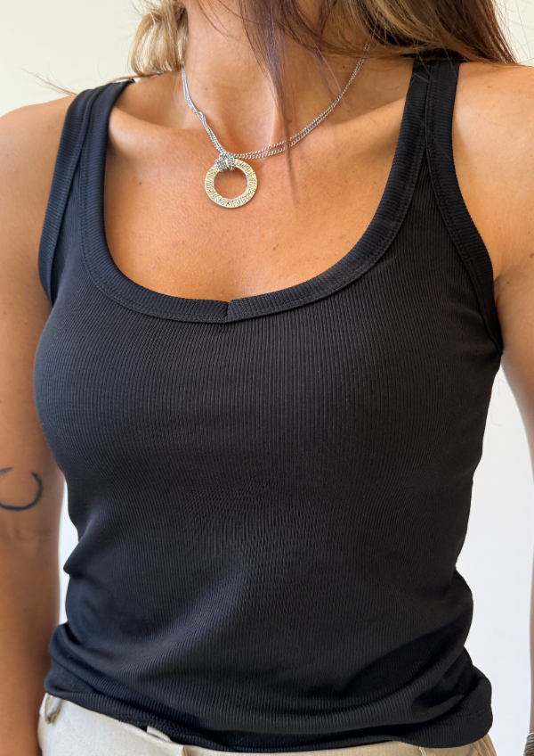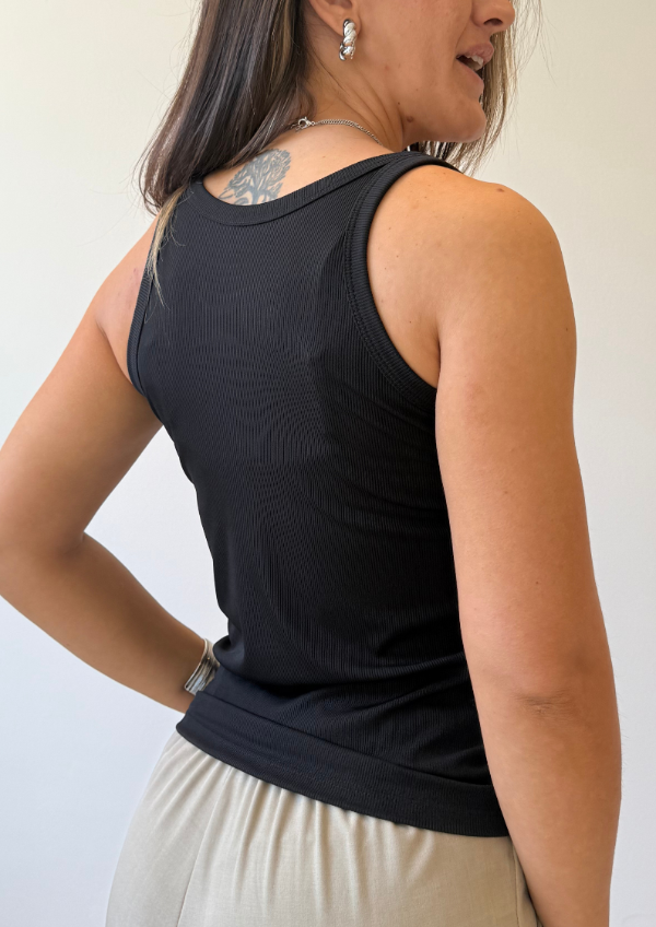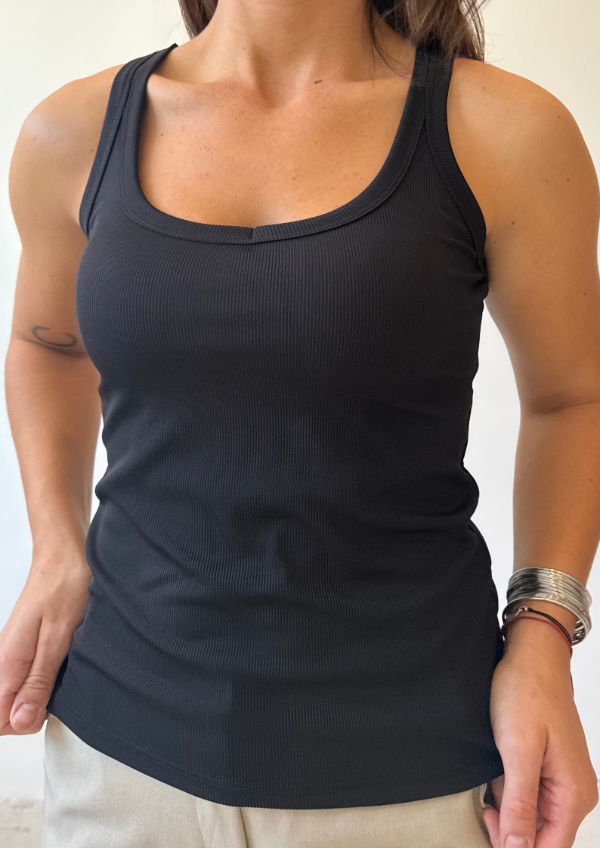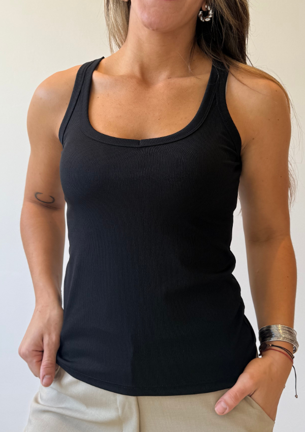 • Remera musculosa, super elastizada, con vivo ancho, escote cuadrado con pico.