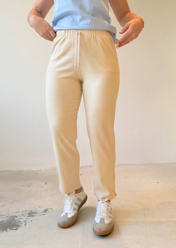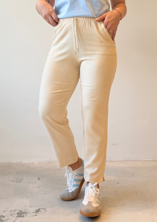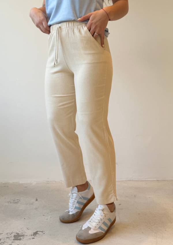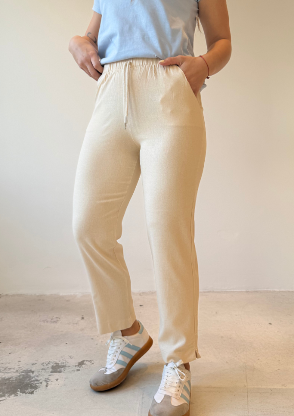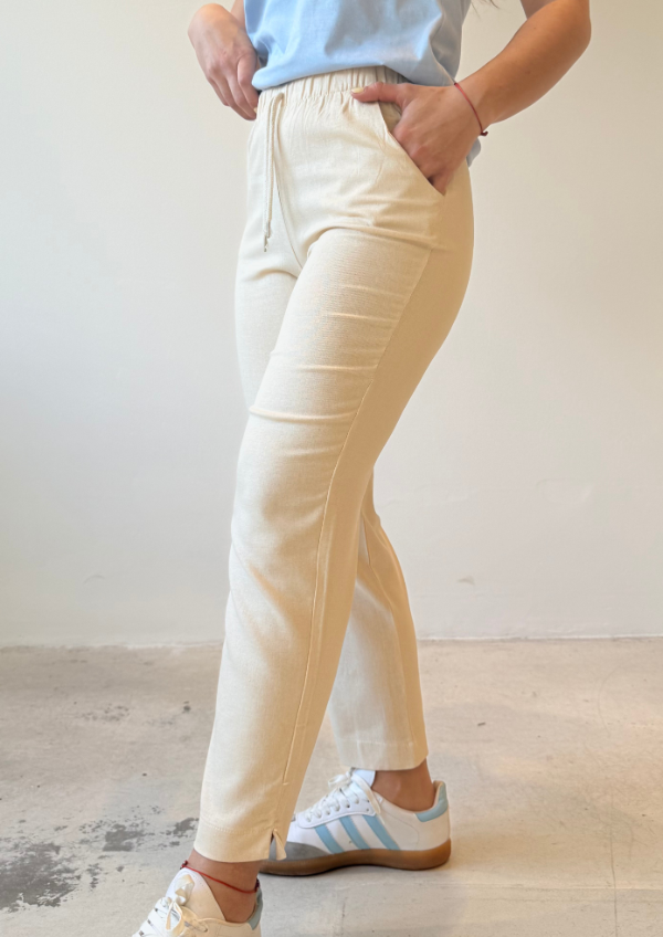 • Pantalón cigarette (largo al tobillo) con bolsillo. Es tiro alto con elástico en toda la cintura. Cordón simulado al tono. Tiene un tajo como detalle en el ruedo.