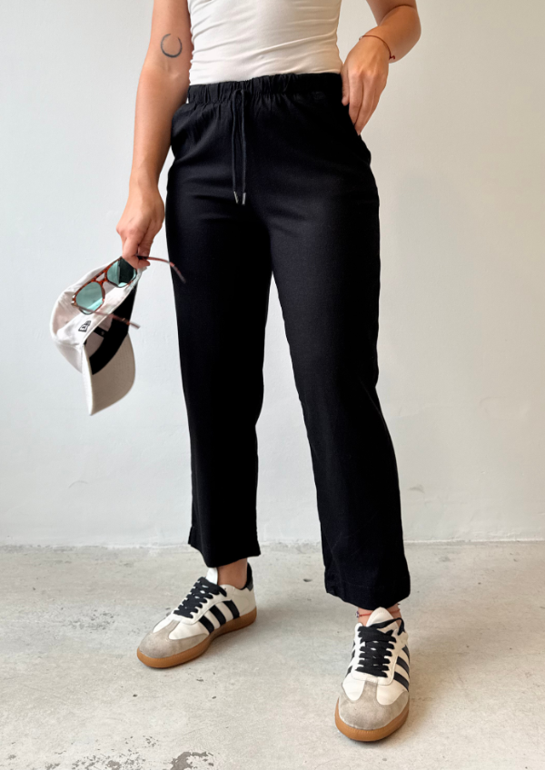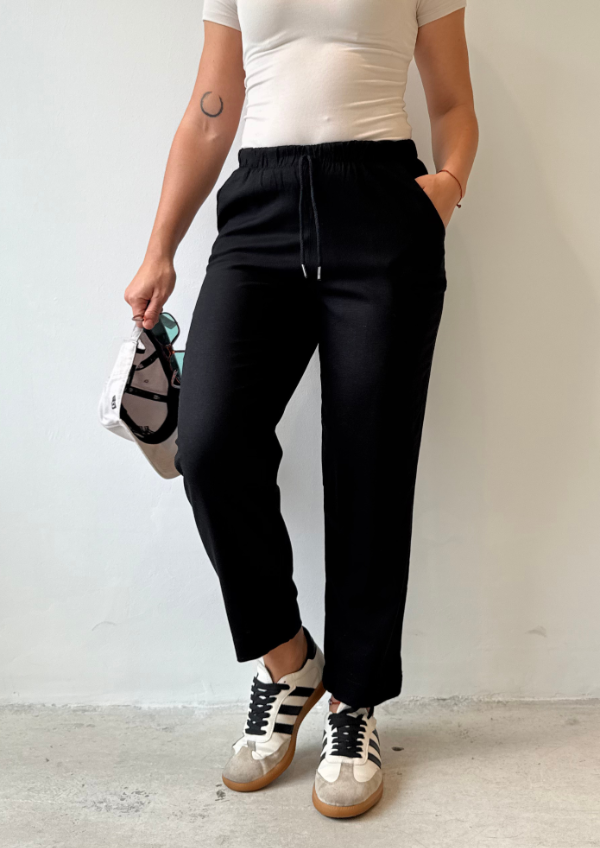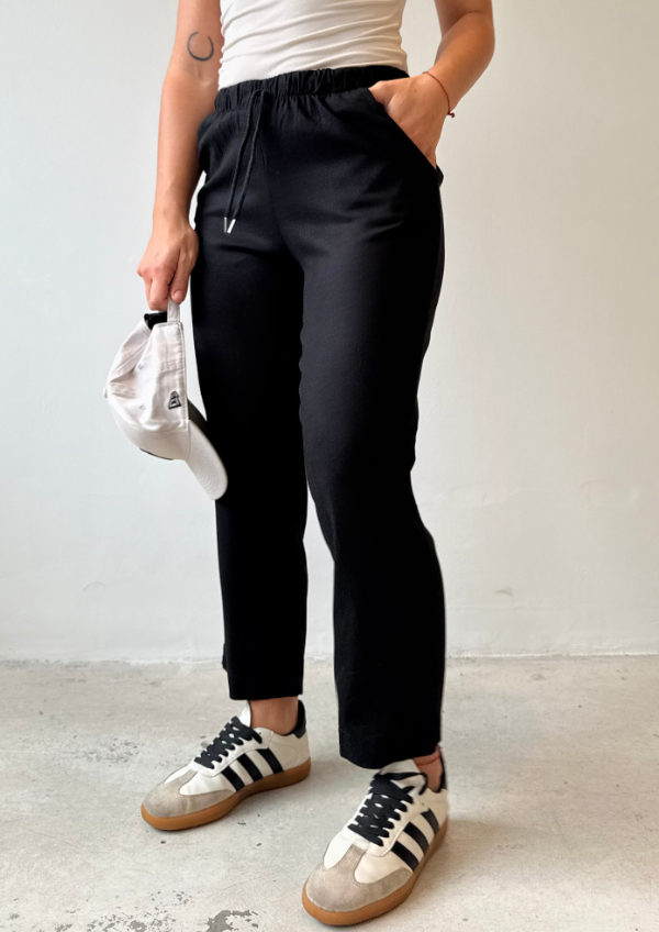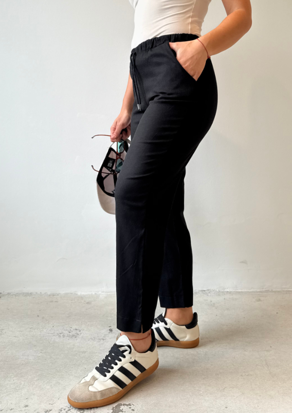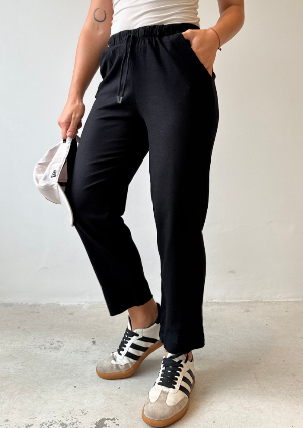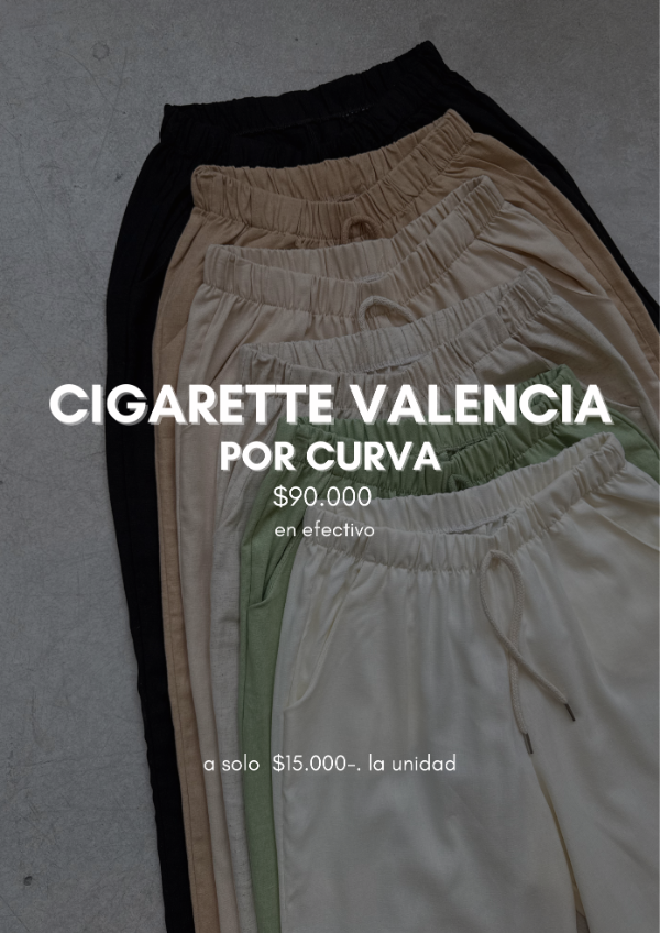 • Pantalón cigarette (largo al tobillo) con bolsillo. Es tiro alto con elástico en toda la cintura. Cordón simulado al tono. Tiene un tajo como detalle en el ruedo.