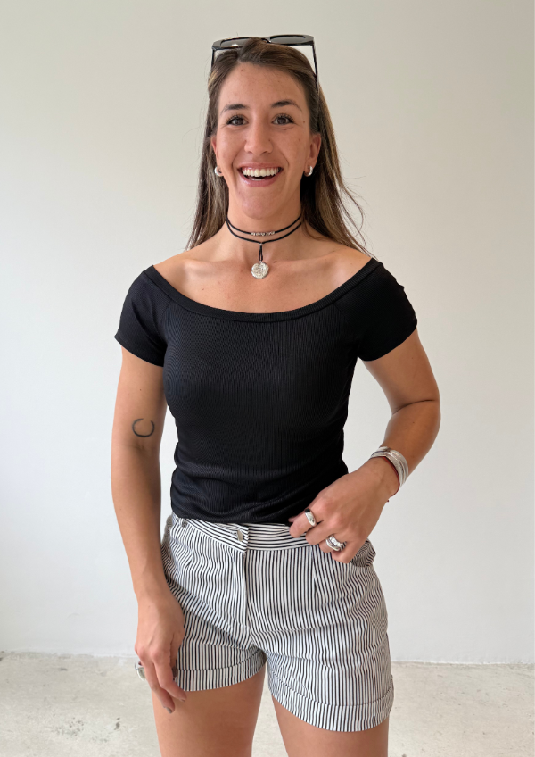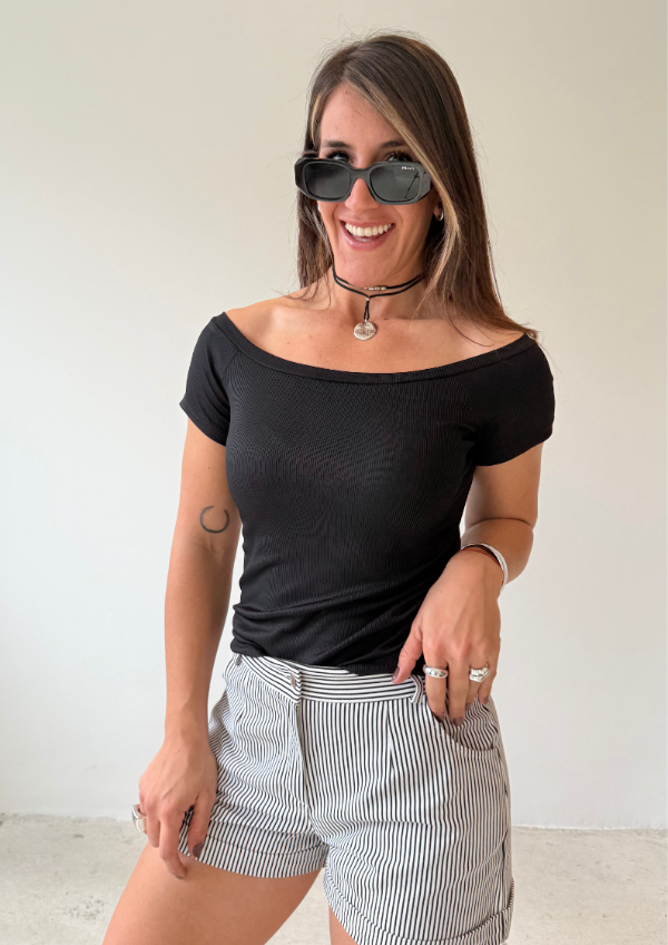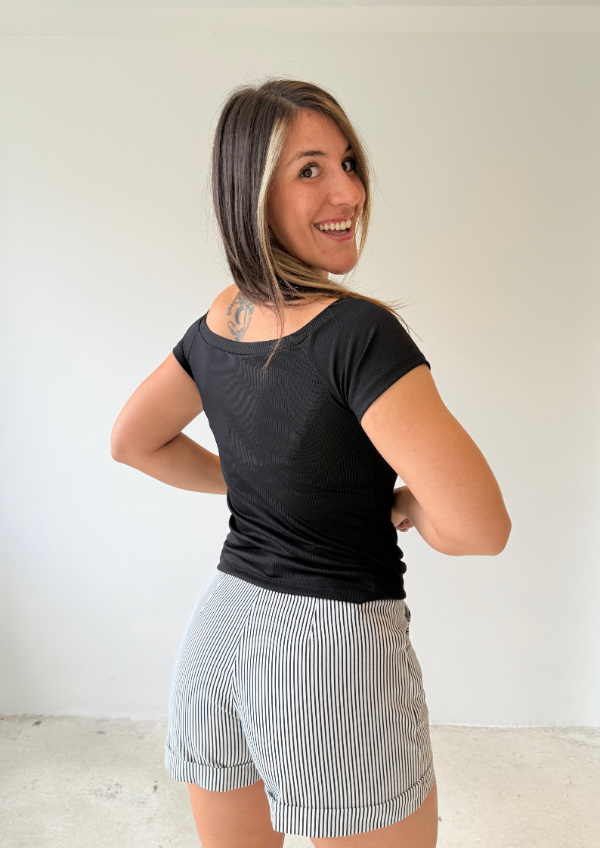 • Remera manga corta. El modelo se puede usar de 2 maneras distintas: con la manga en los hombros, tipo escote paisana. O con las mangas subidas con un escote tipo bote. Super versátil y se adapta a la comodidad de cualquier cuerpo.